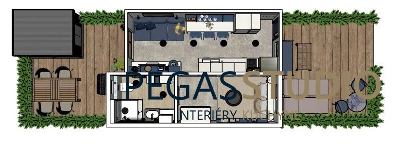 Pomocou malej prístavby vznikne priestor na spálňu a kúpeľňu s WC, čo výrazne zvyšuje komfort. V dennej zóne sa nachádza vstup, kuchynská a obývacia časť, navrhnuté v svetlom, uvoľnenom štýle.