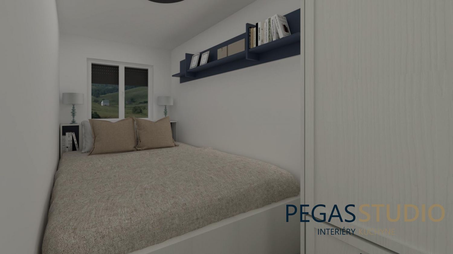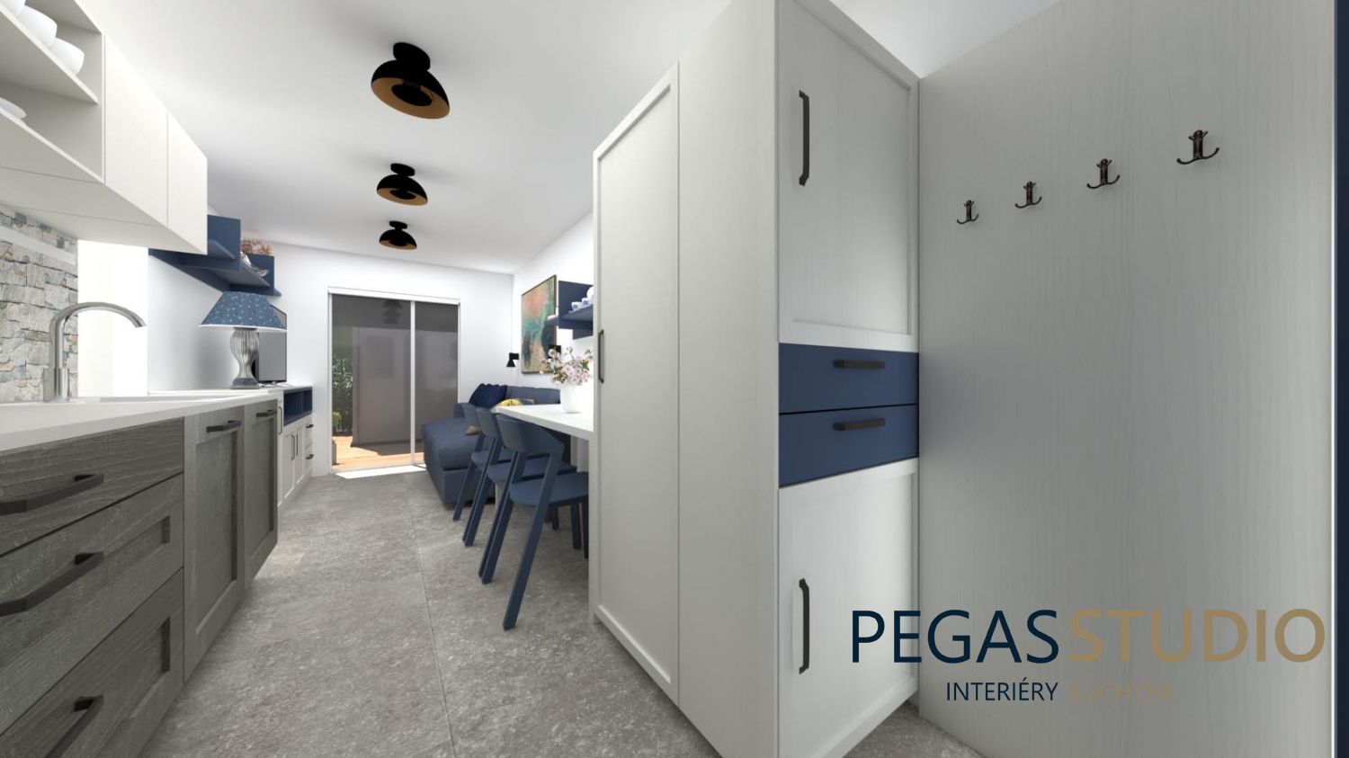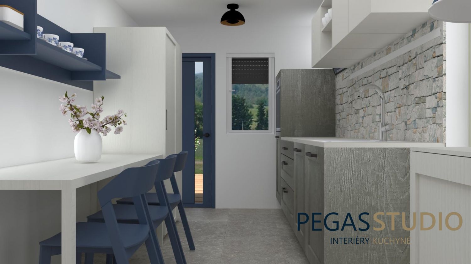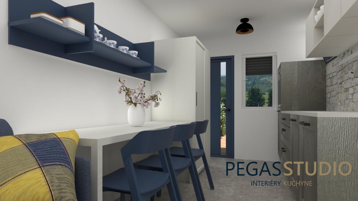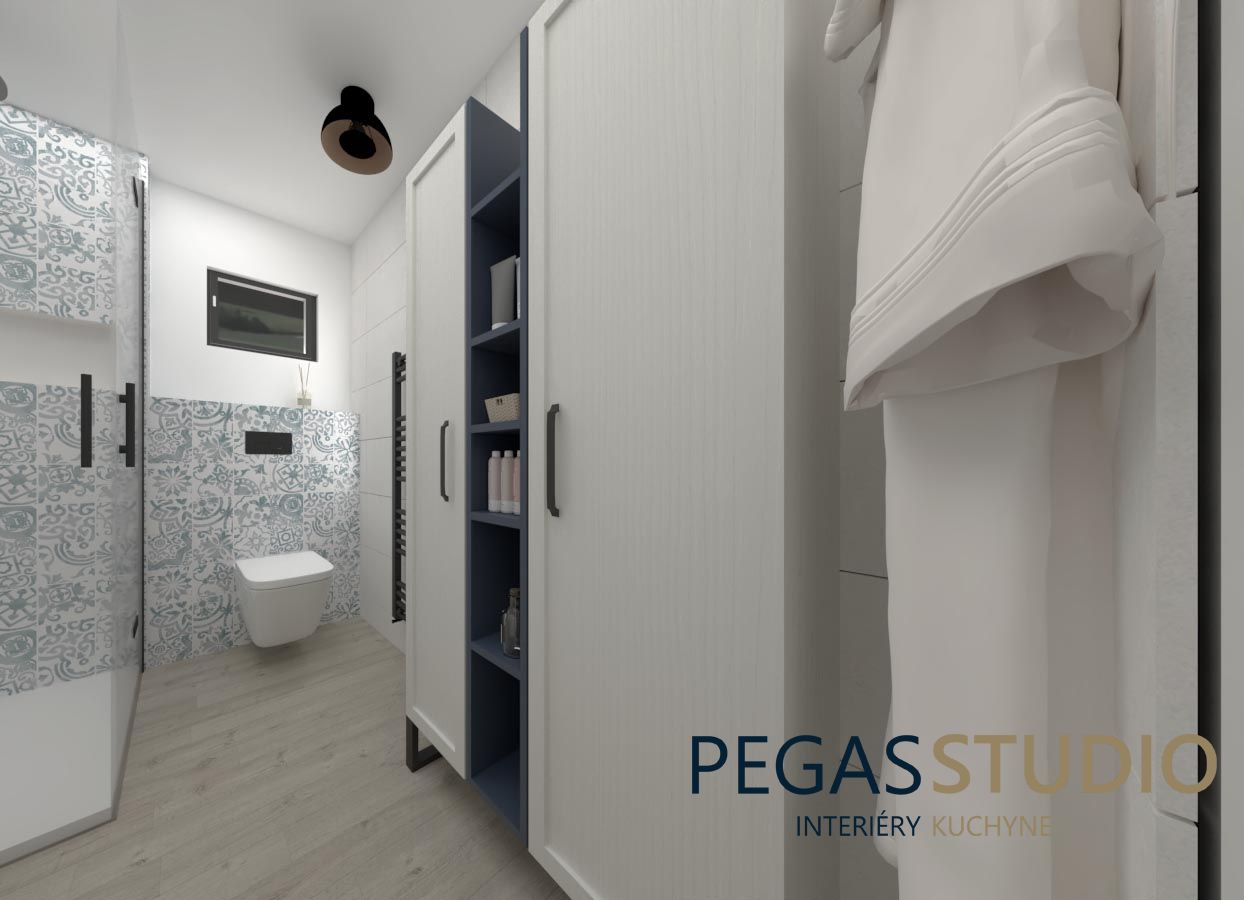 Základom je biely nábytok doplnený o modrú farbu, ktorá symbolicky odkazuje na umiestnenie chatky v kúpeľnom prostredí – voda, relax, pokoj.