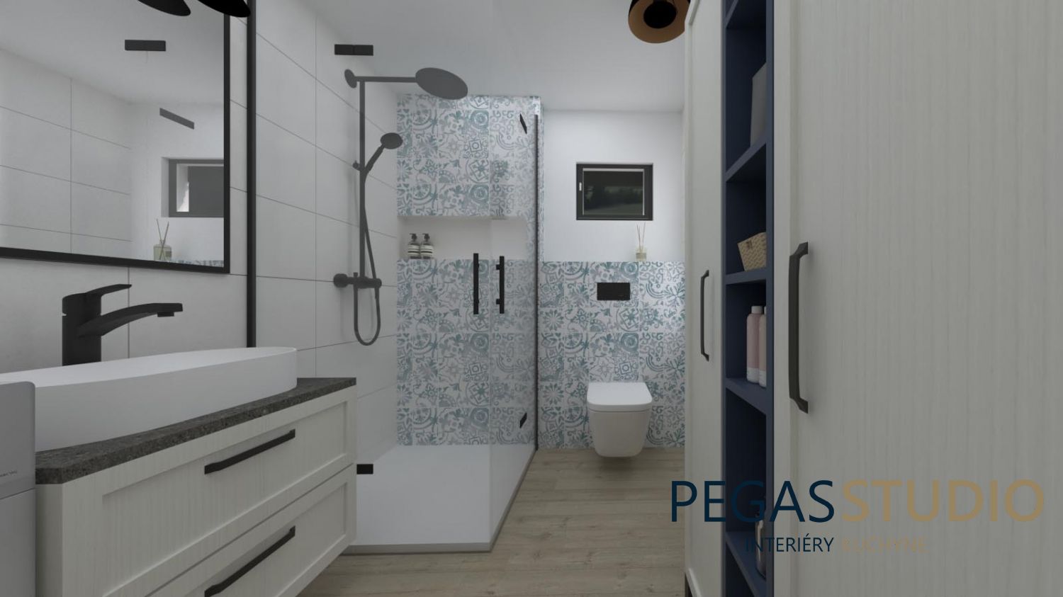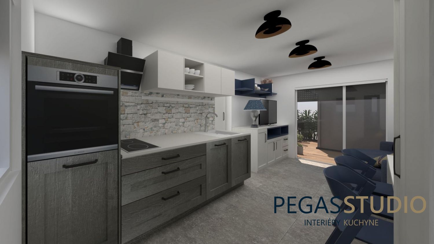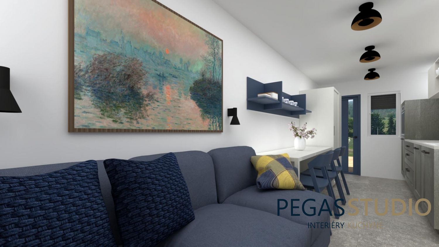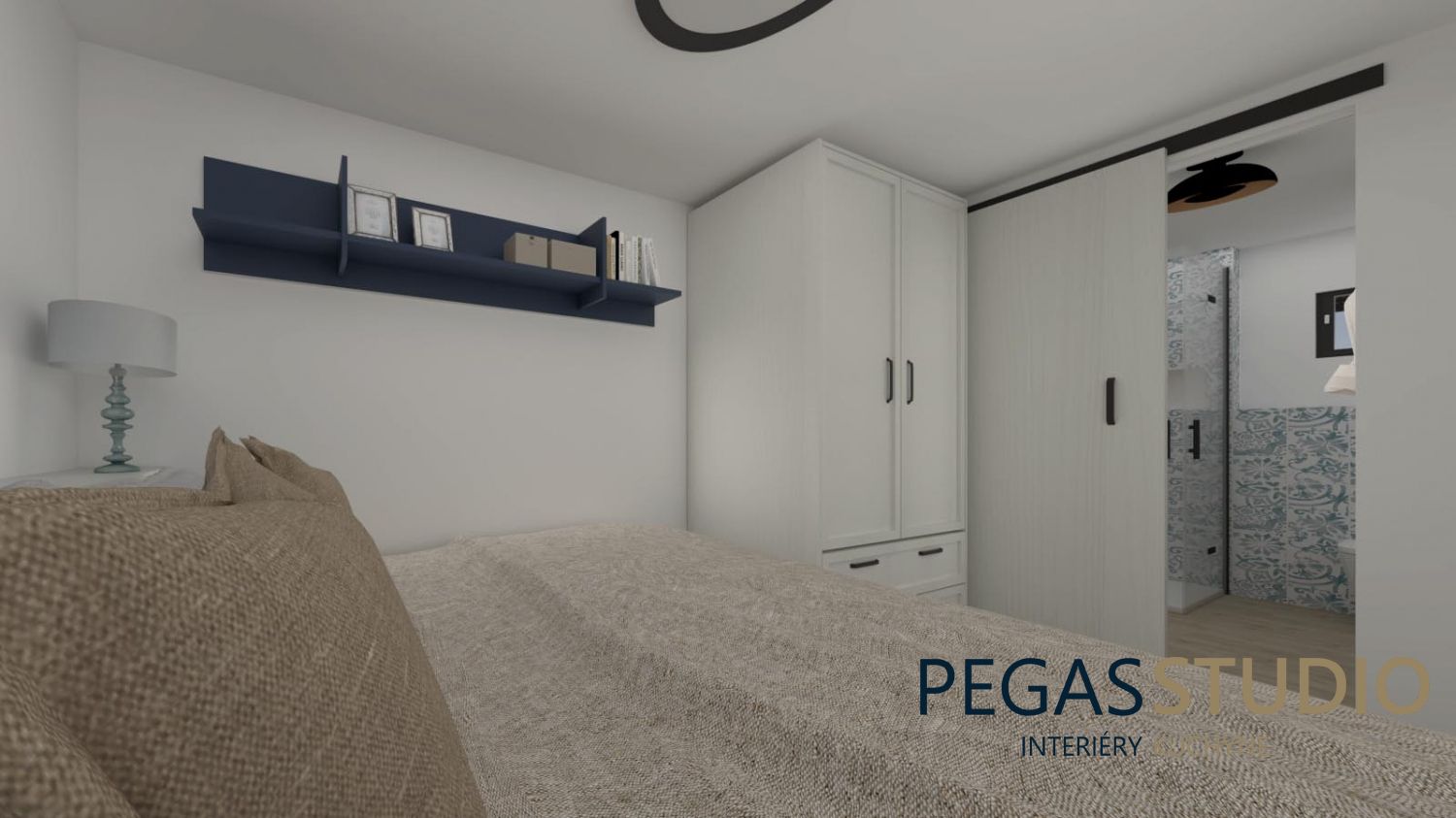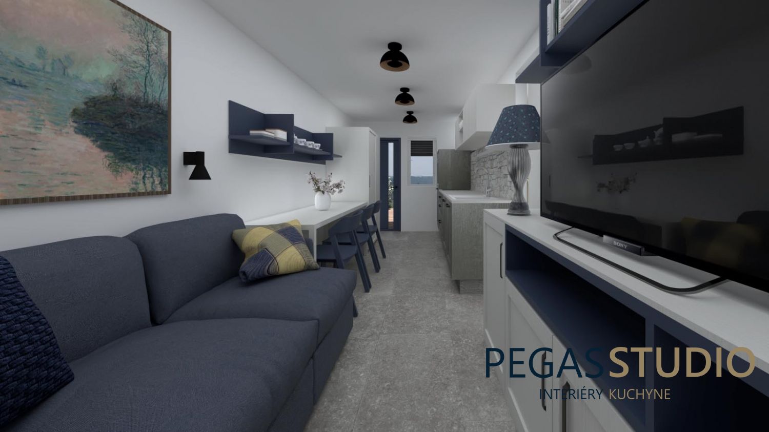 Základom je biely nábytok doplnený o modrú farbu, ktorá symbolicky odkazuje na umiestnenie chatky v kúpeľnom prostredí – voda, relax, pokoj.
