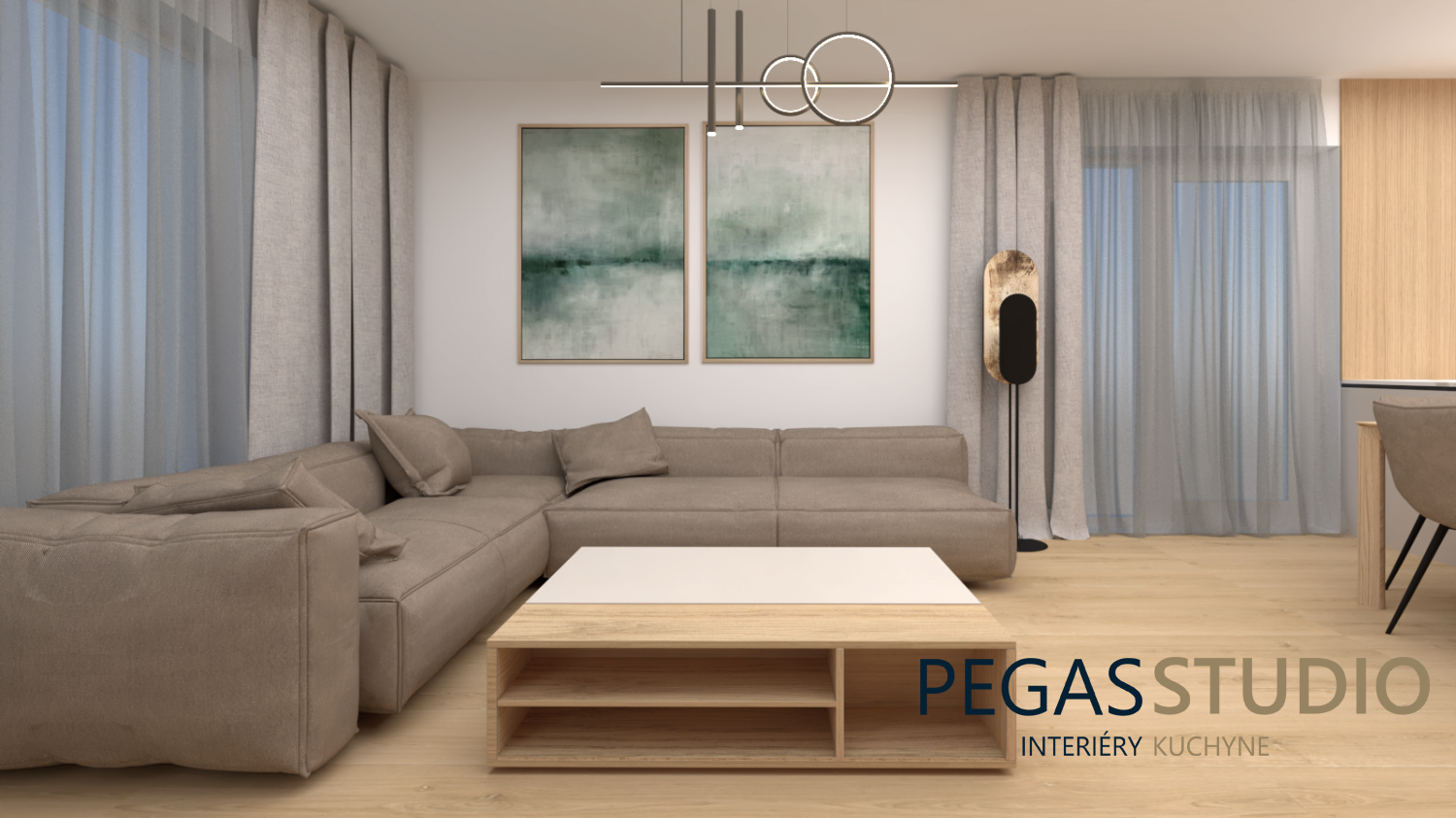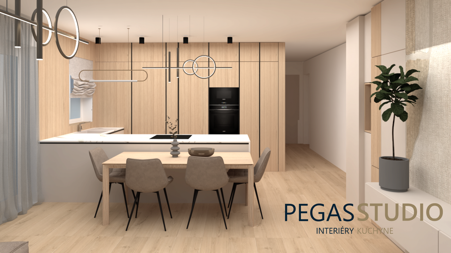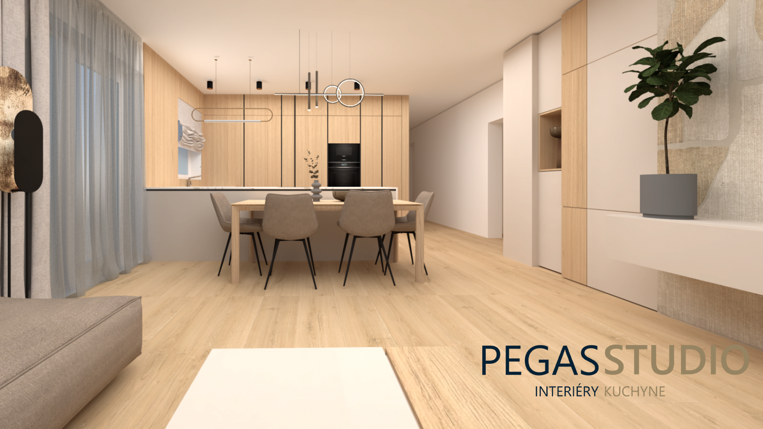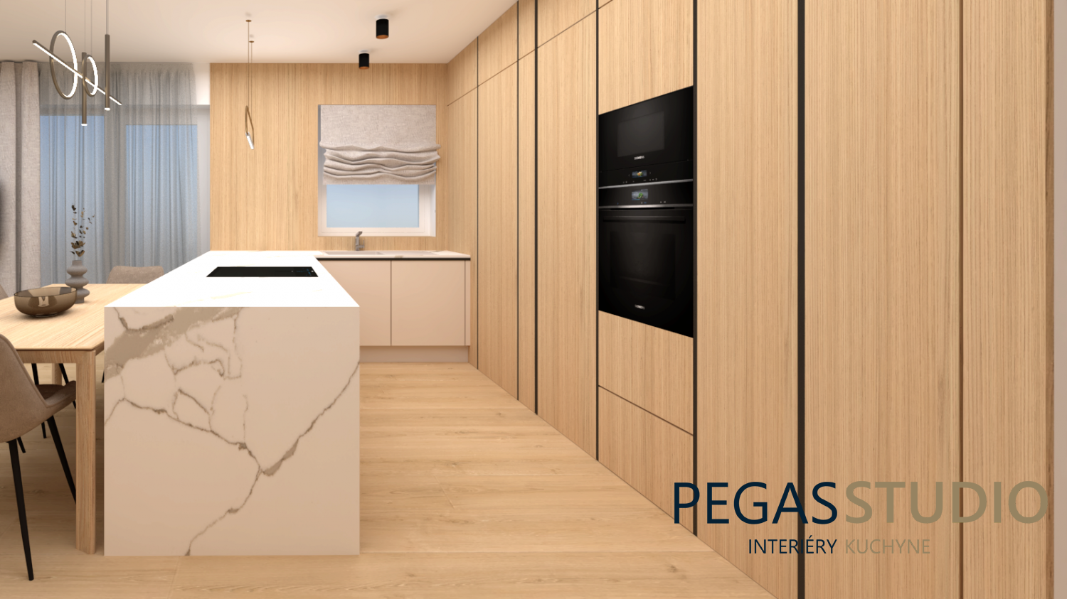 Interiér je ladený do kombinácie svetlého dreva a neutrálnych tónov. Kuchyňa je navrhnutá ako čistá minimalistická zostava s integrovanými spotrebičmi a dominantným ostrovom.