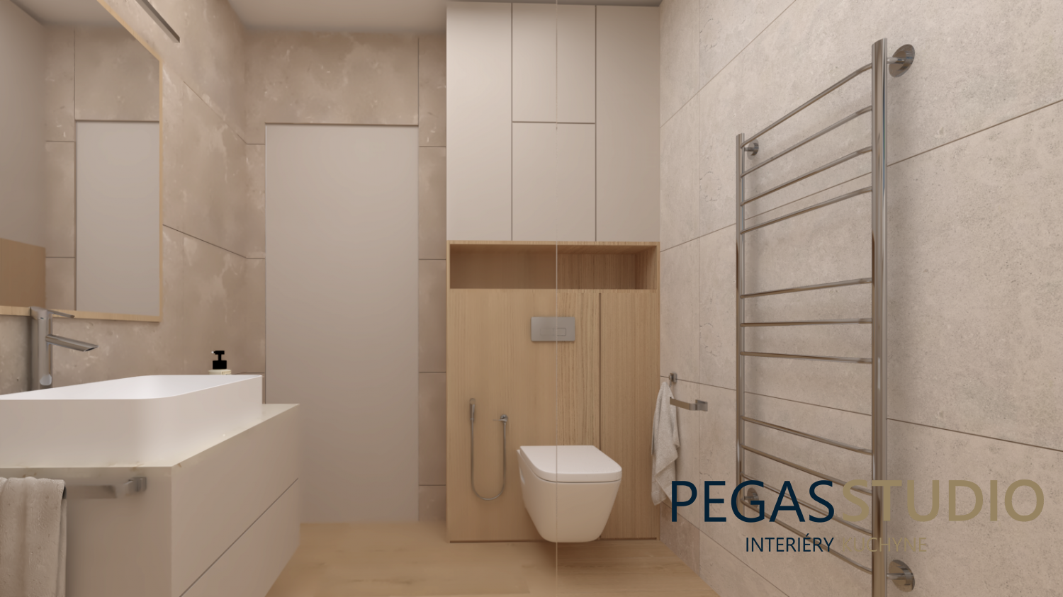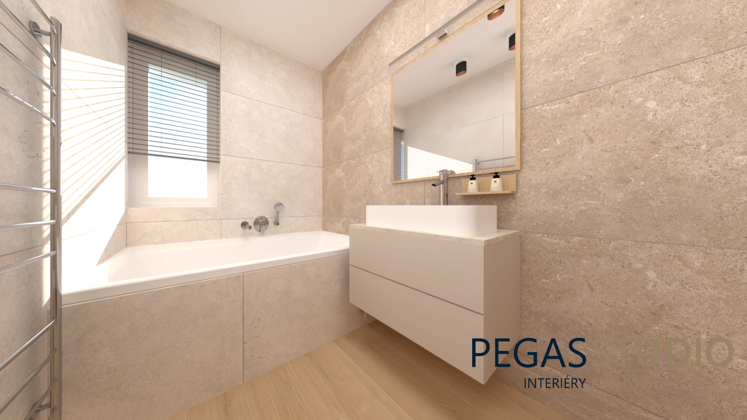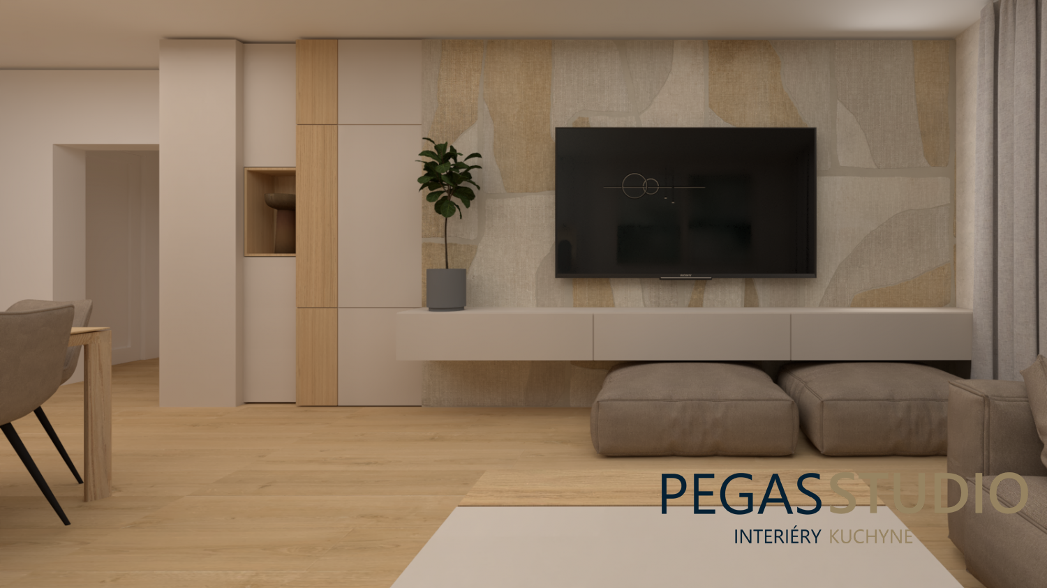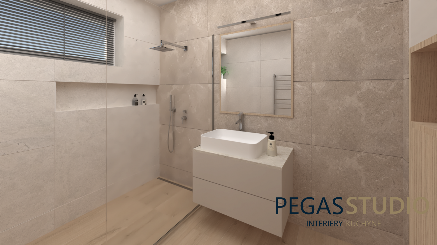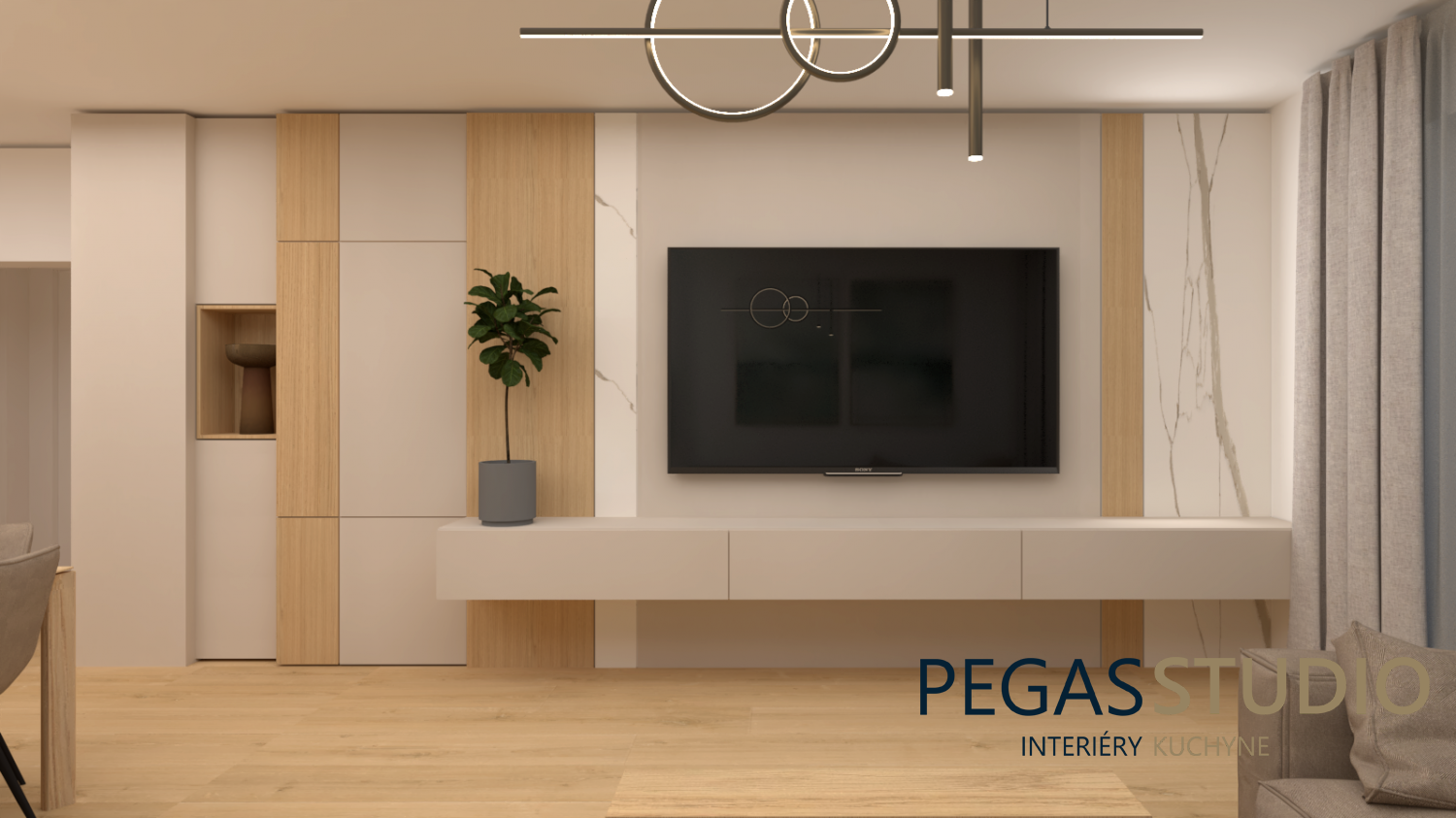 Obývacej izbe dominuje TV stena s nábytkom na mieru. Kúpeľne sú riešené v prírodných béžovo-kamenných odtieňoch s dôrazom na funkčnosť, čisté línie a praktické detaily.