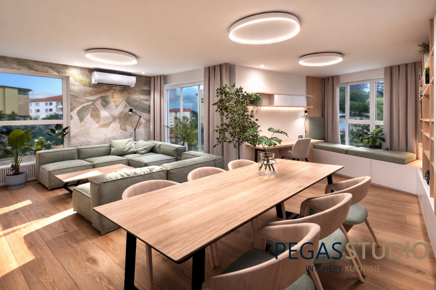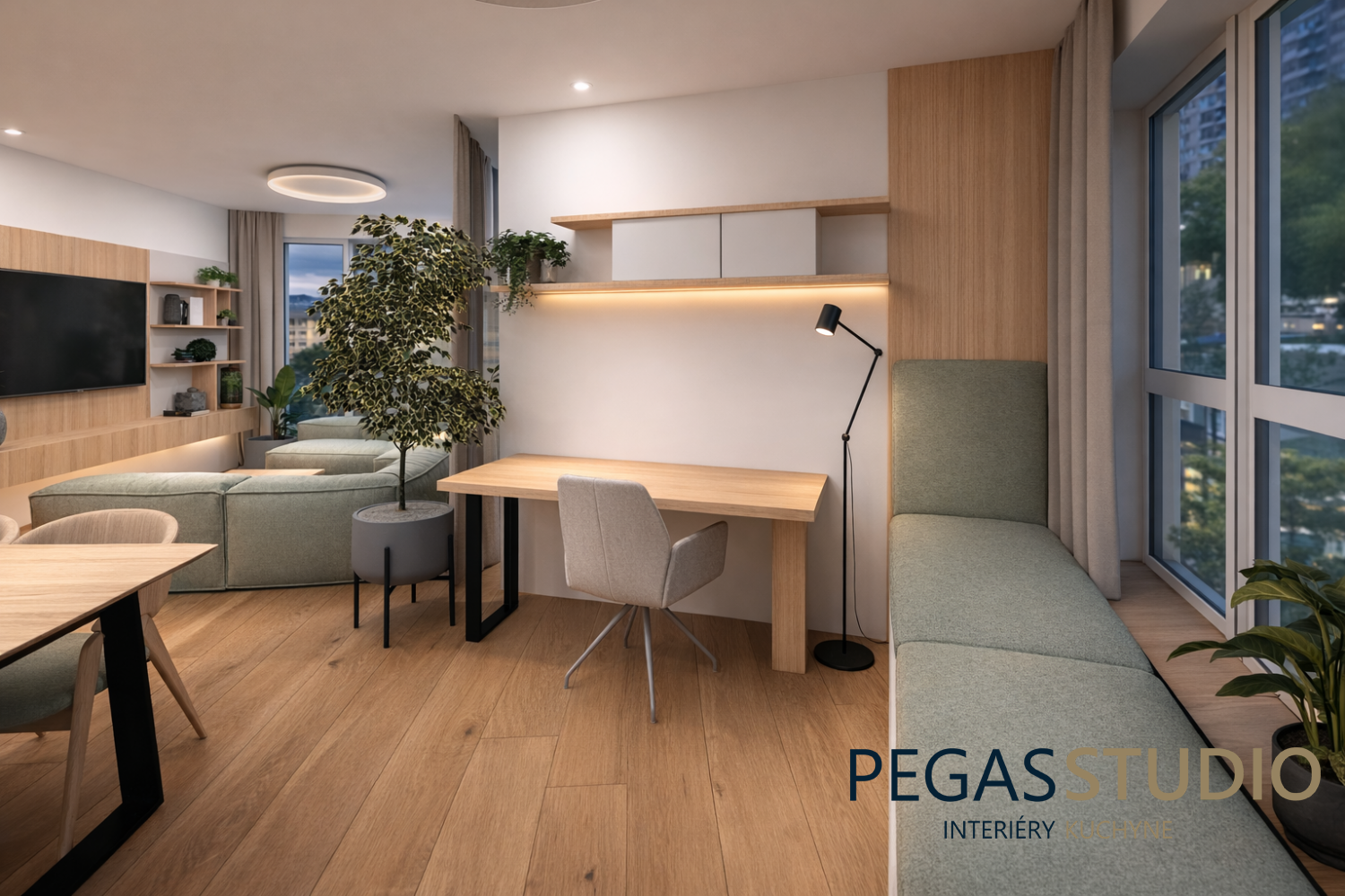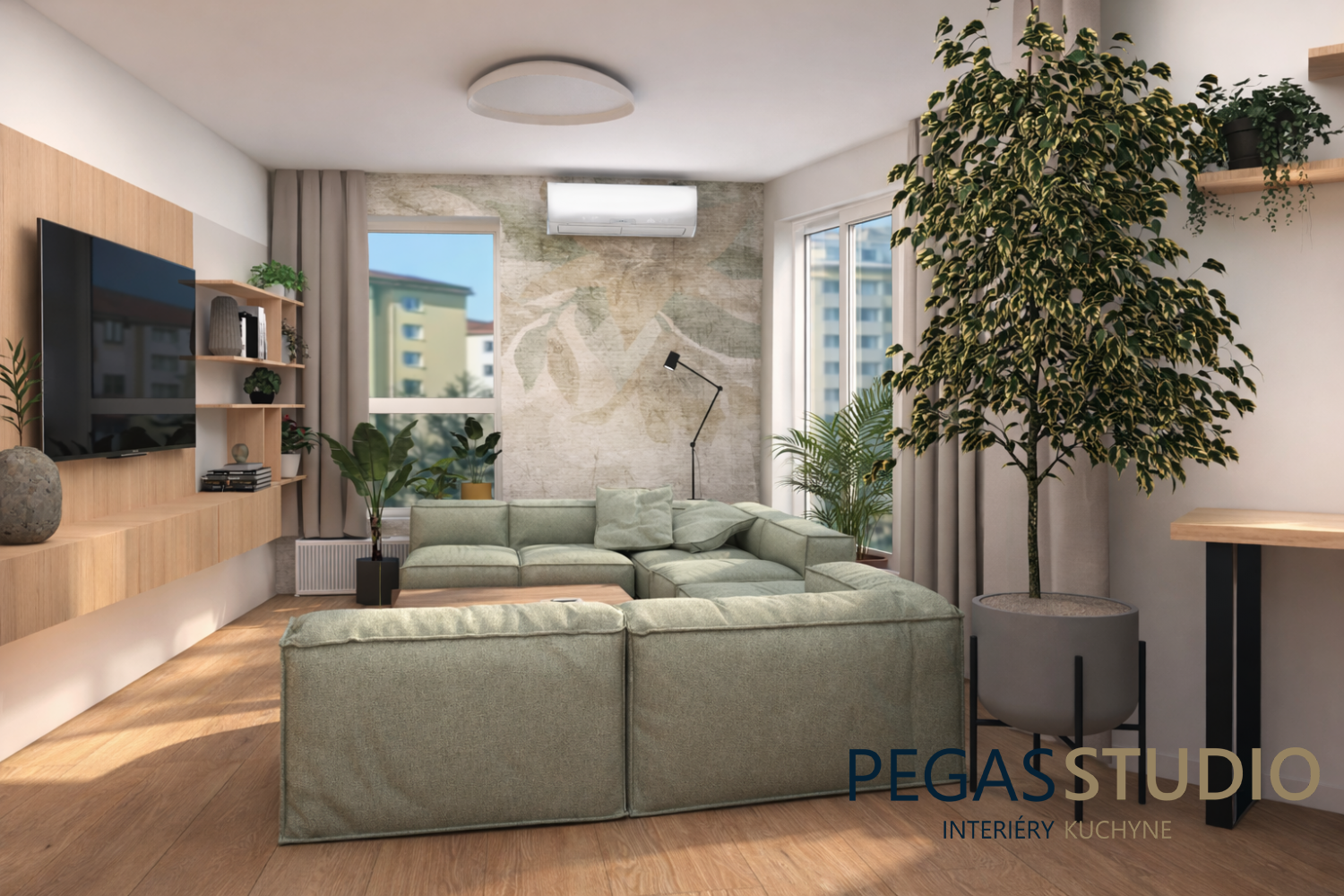 Dominantou obývacej časti je pohodlná modulová sedačka v jemnom zelenom odtieni, ktorá spolu s rastlinami a prírodnými materiálmi vytvára pokojný a uvoľnený charakter priestoru. TV zostava je navrhnutá minimalisticky a doplnená o otvorené police.