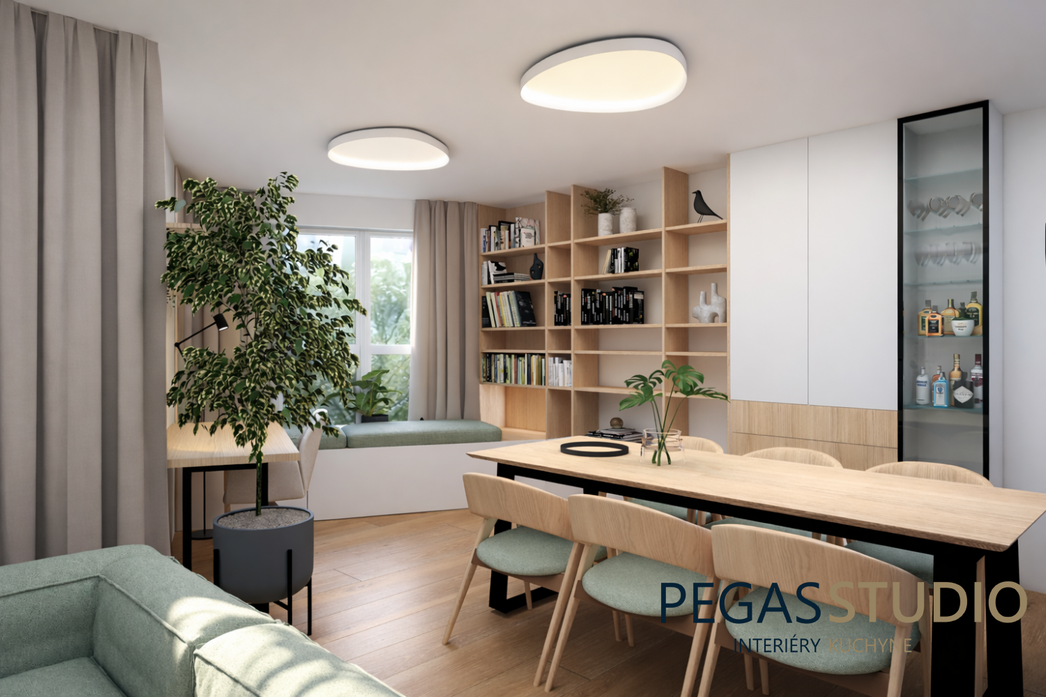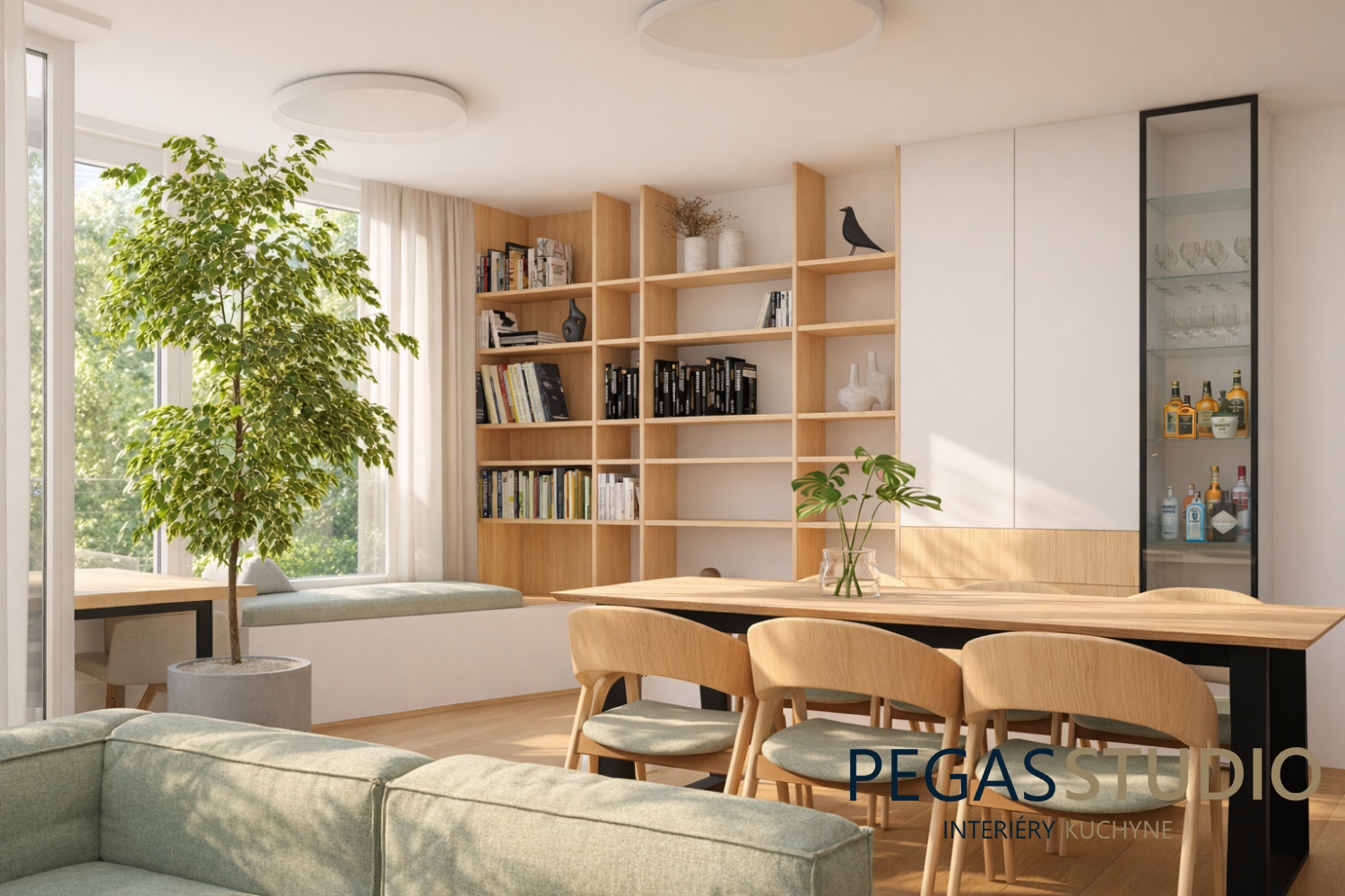Pri návrhu bolo potrebné vyriešiť aj menej ideálne umiestnenie radiátorov pod oknami v jedálni aj v obývacej izbe. Tie sa podarilo elegantne začleniť do návrhu pomocou zabudovaných sedení, ktoré ich vizuálne ukrývajú a zároveň je vytvorené príjemné miesto na oddych. Toto riešenie prirodzene nadväzuje na knižnicu na mieru, ktorá tvorí výrazný architektonický prvok interiéru a poskytuje dostatok priestoru na knihy, dekorácie aj osobné predmety.
