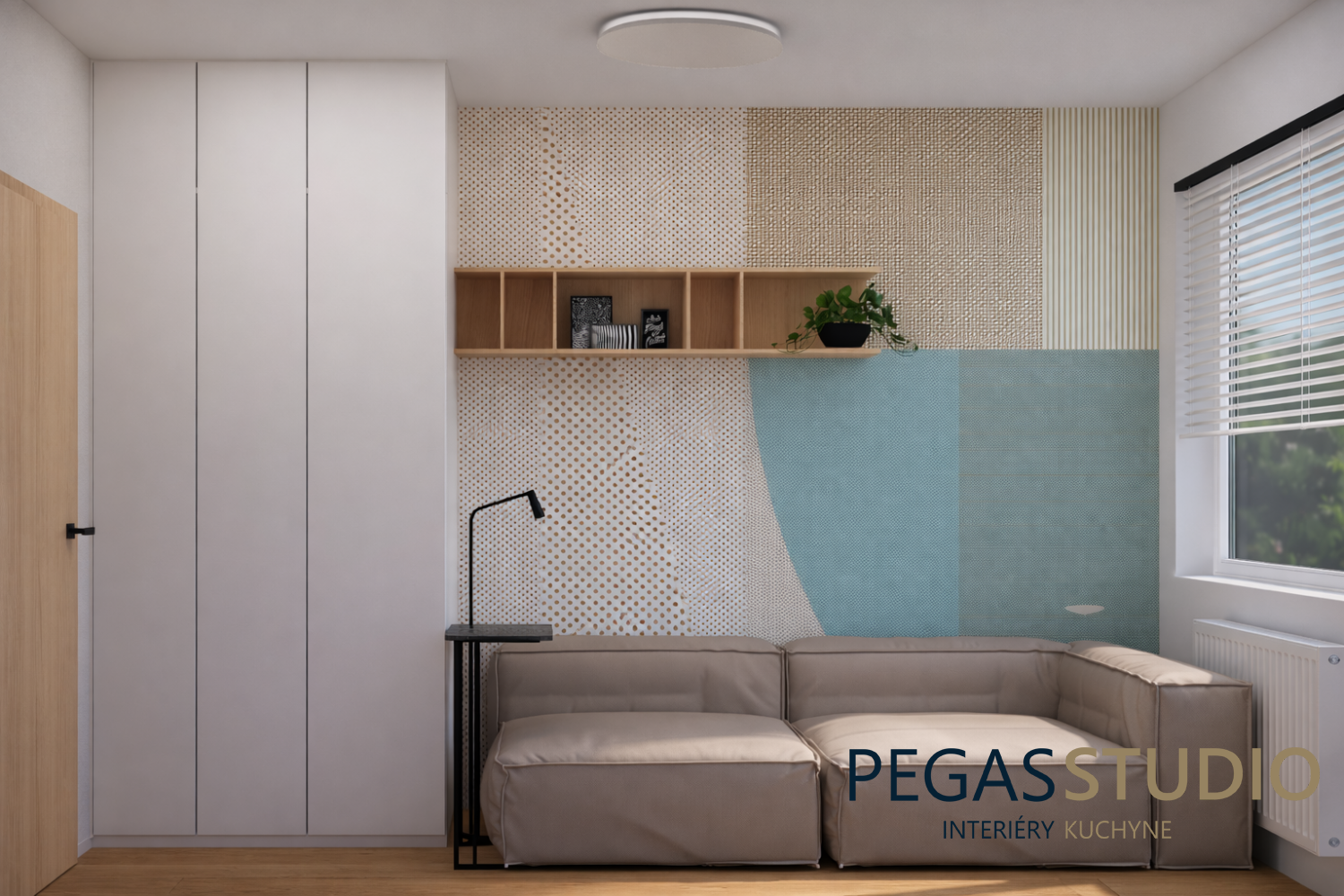 Spálňa je navrhnutá v jemnej, upokojujúcej farebnosti. Dominantným prvkom je veľkoformátová tapeta s prírodným motívom, ktorá dodáva priestoru hĺbku a charakter.