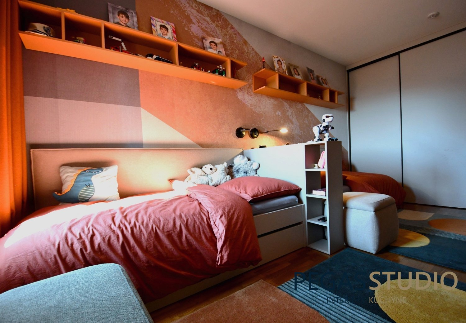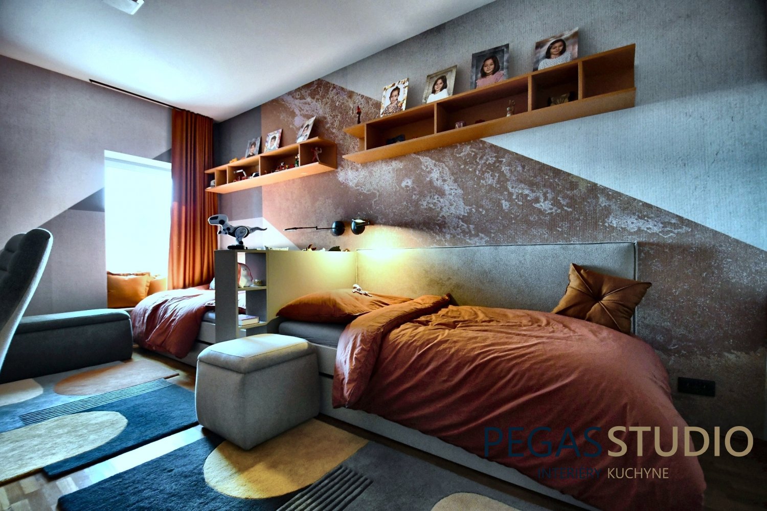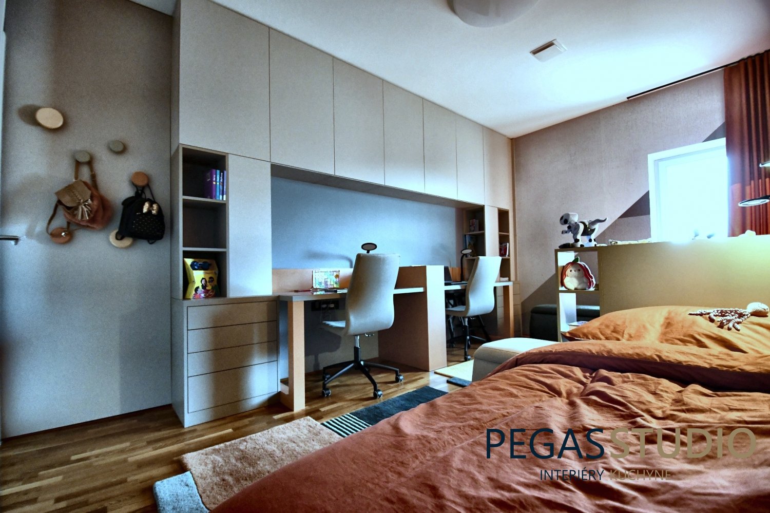 Súčasťou návrhu je nábytková zostava vyrobená na mieru, ktorá zahŕňa pracovný stôl pre dve deti, vstavané skrinky a otvorené police na knihy a osobné predmety. Takéto riešenie umožňuje efektívne využitie priestoru a zároveň poskytuje dostatok úložných možností.
