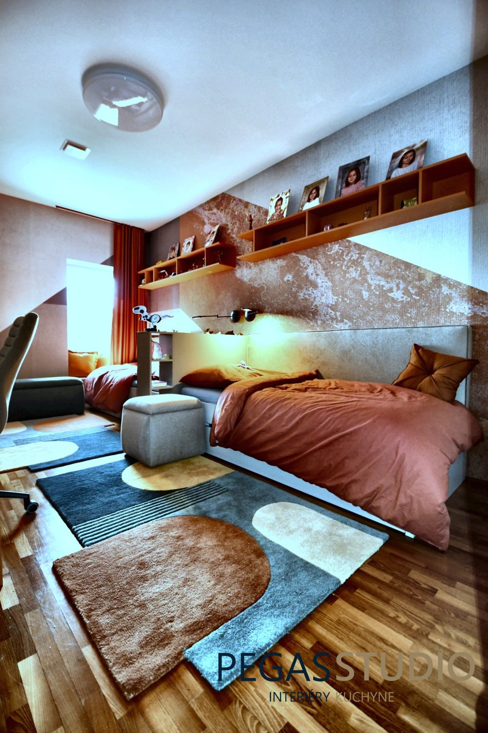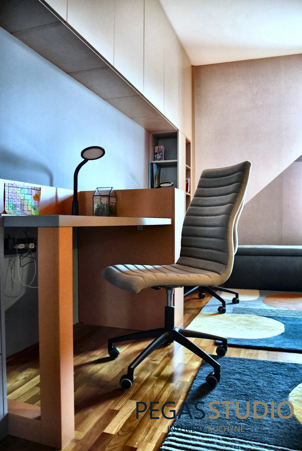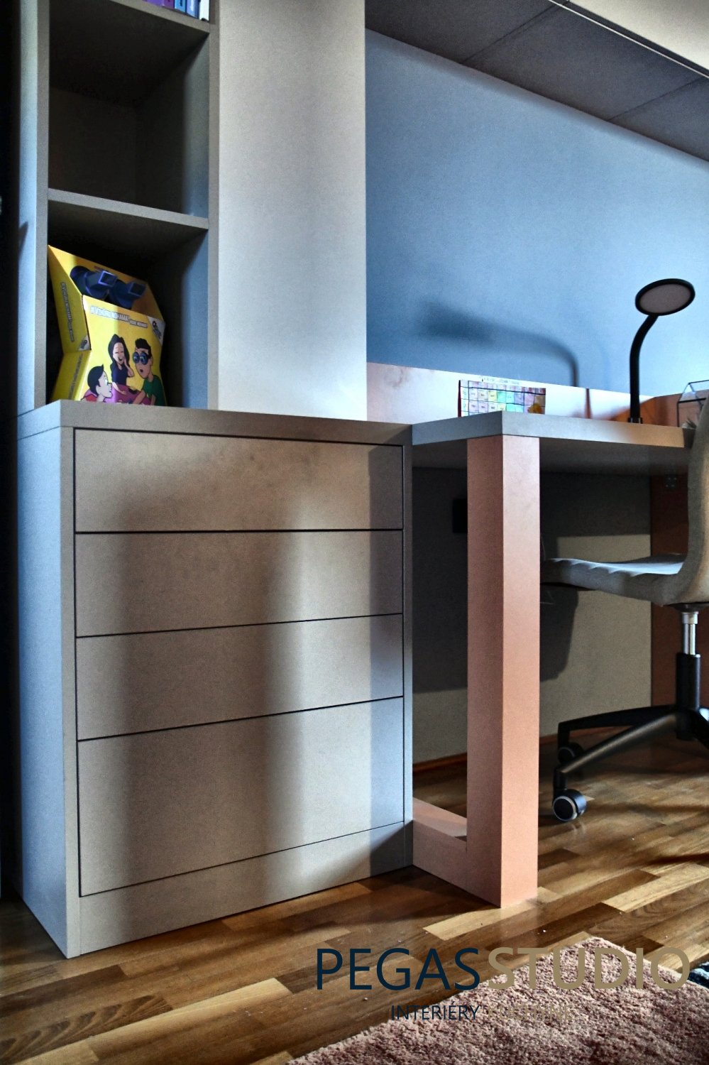 Súčasťou návrhu je nábytková zostava vyrobená na mieru, ktorá zahŕňa pracovný stôl pre dve deti, vstavané skrinky a otvorené police na knihy a osobné predmety. Takéto riešenie umožňuje efektívne využitie priestoru a zároveň poskytuje dostatok úložných možností.