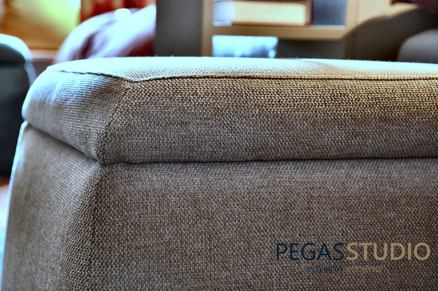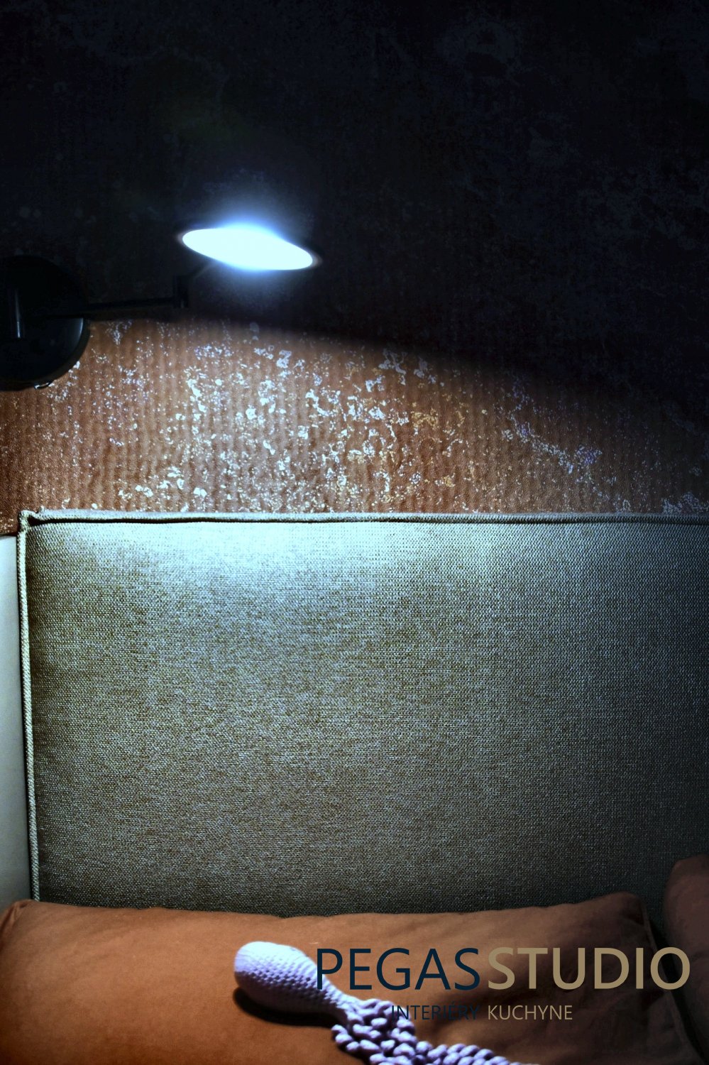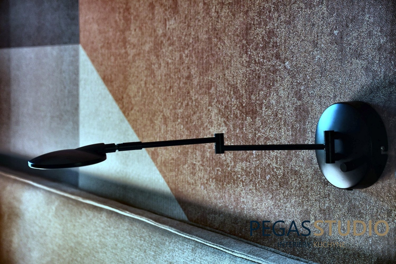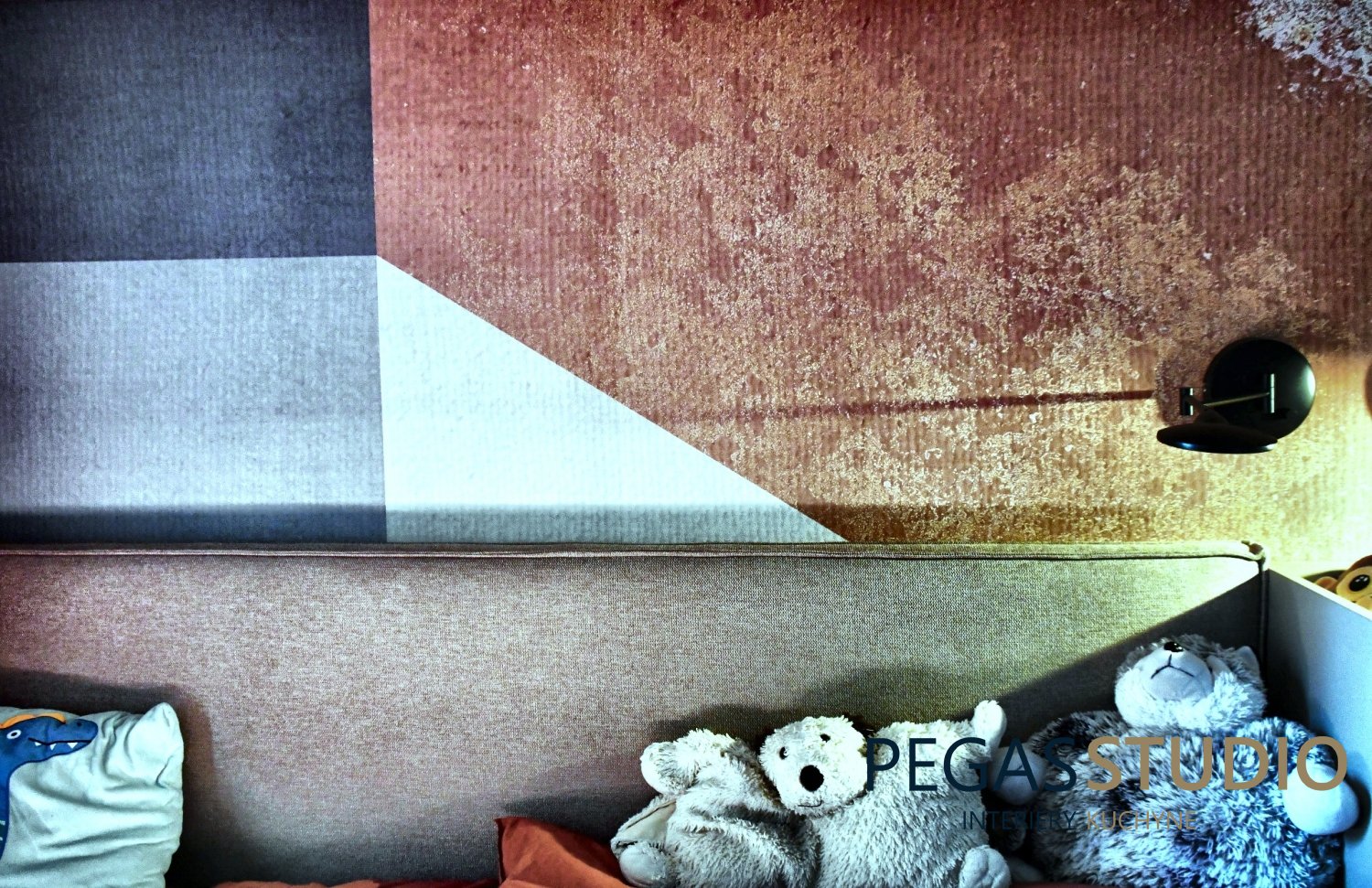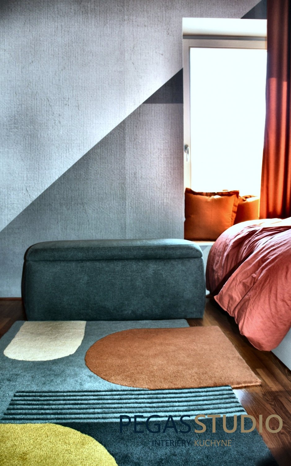 Dominantným prvkom interiéru je geometrická kompozícia na stene, ktorá pracuje s jemnými farebnými prechodmi a dodáva miestnosti dynamiku. Tento motív zároveň prepája farebnosť celého interiéru a vytvára vizuálne zjednotenie priestoru.